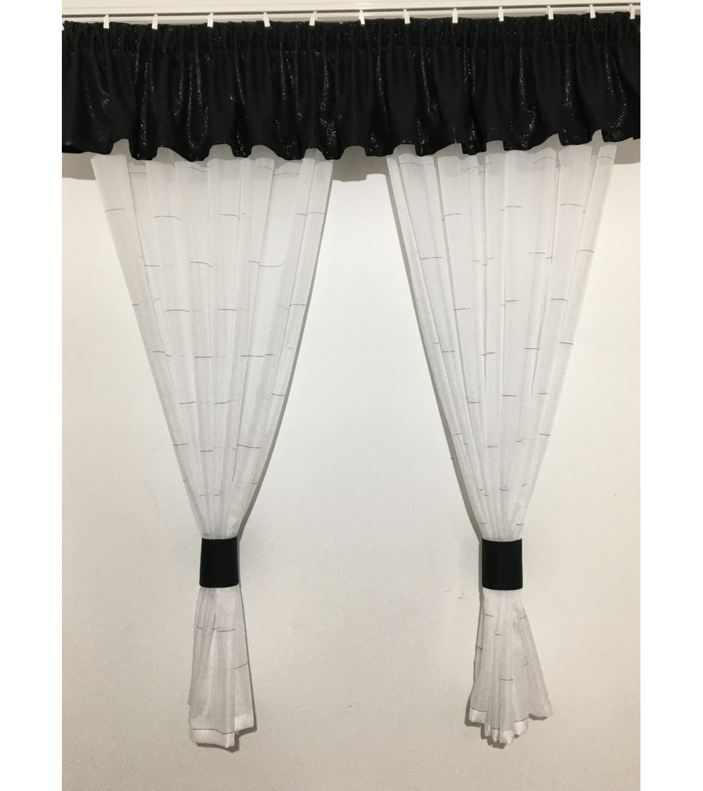 Firana woalowa biała w czarno-srebrne paseczki wys. 160, szer. 140 (jedna część) na taśmie marszczącej spinana paskiem na rzep z czarnej błyszczącej tkaniny. Lambrekin czarny błysk wys. 30cm, szer. 280. Szycie na zamówienie.