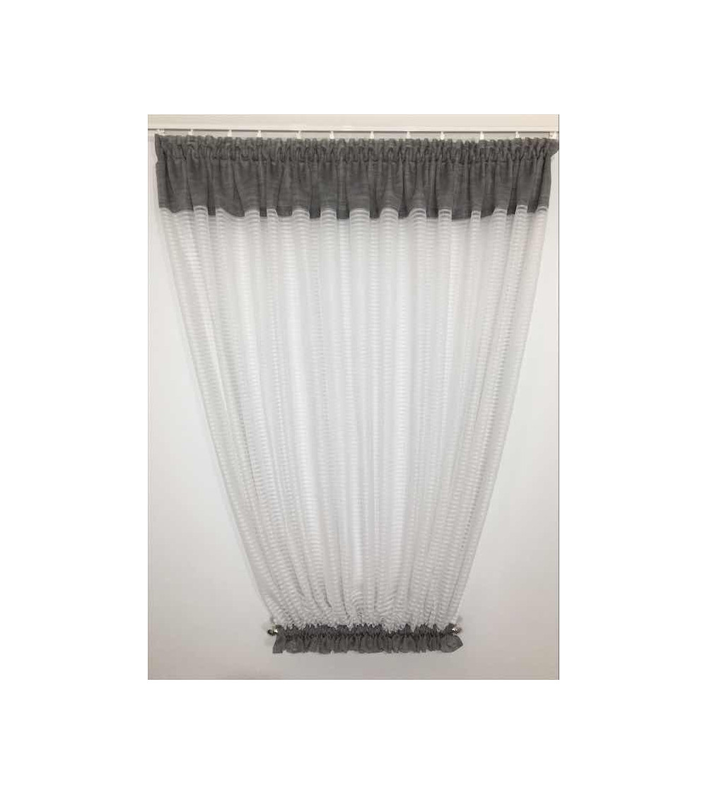firana białe paseczki połączona z lekką, szarą tkaniną, marszczona na taśmie, dół zakończony ozdobnym drążkiem w kolorze chrom, wys.130cm, szer.300cm