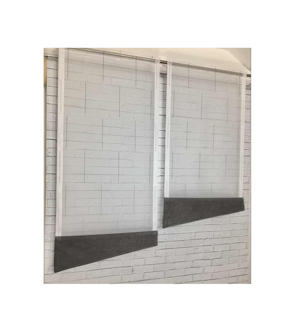 firana panelowa z białego woalu w czarne kreski połączona z szarym welurem, szer. 60cm wys. 110cm x1szt, szer. 60cm wys. 130cm x1szt