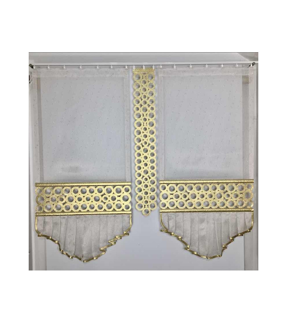 delikatna firanka "złoty deszczyk" połączona z dekoracyjnym złotym ażurem, szer.60cm wys.130cm x2szt, szer.15 wys.100cm x1szt, zalecane pranie ręczne