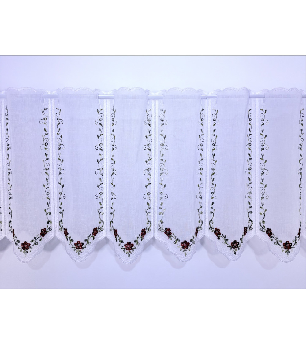 biała etamina z haftem w odcieniach zieleni i czerwieni, segmentowa, wysokość 40cm, cena za 1mb